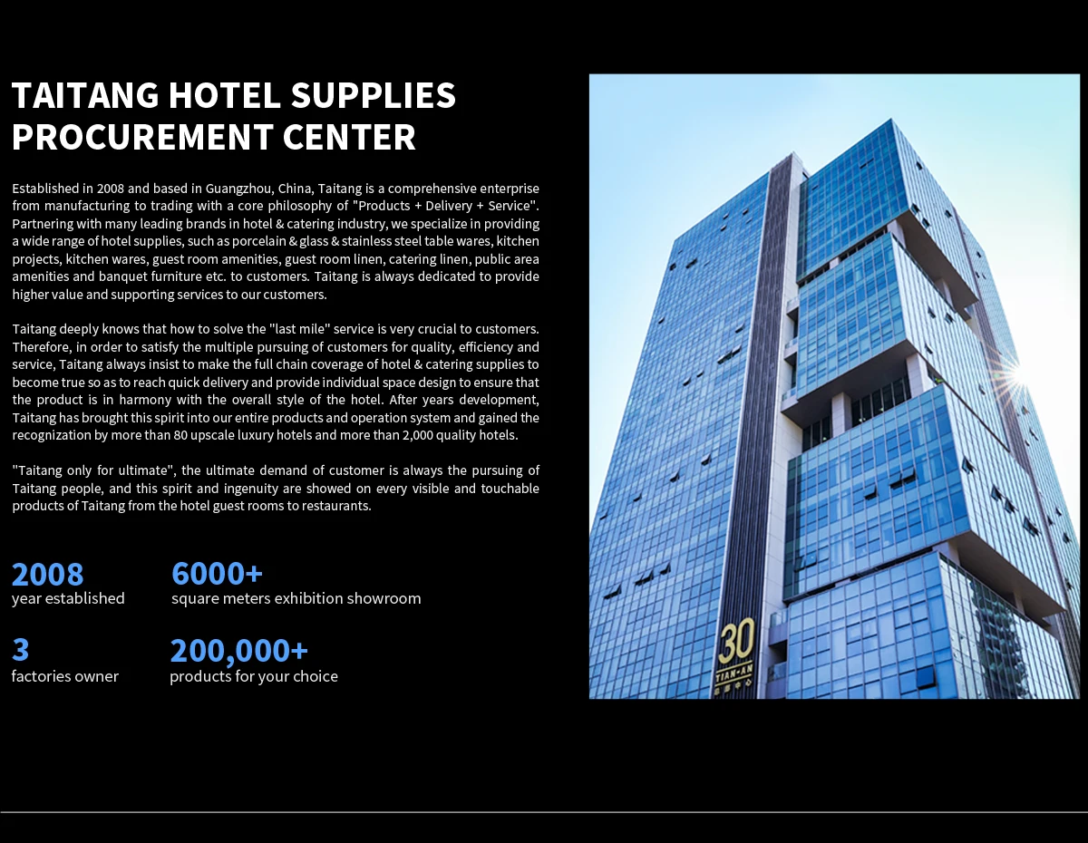 Taitang, established in 2008 and located in Guangzhou, China, is a comprehensive enterprise from manufacturing to tradingwith a core philosophy of "Products + Delivery + Service". Partnering with many leading brands in hotel & catering industrywe specialize in providing a wide range of hotel supplies, such as porcelain & glass & stainless steel table wares, kitchenwares and equipments, guestroom amenities, guestroom linen, catering linen, public area amenities and banguet furnitureetc. to customers. Taitang is always dedicated to provide higher value and high quality services to our customers.